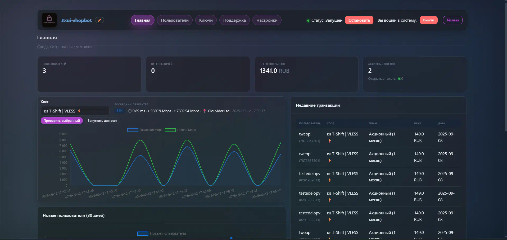 - Веб‑панель "все в одном": сервера, тарифы, пользователи, платежи, спидтесты.