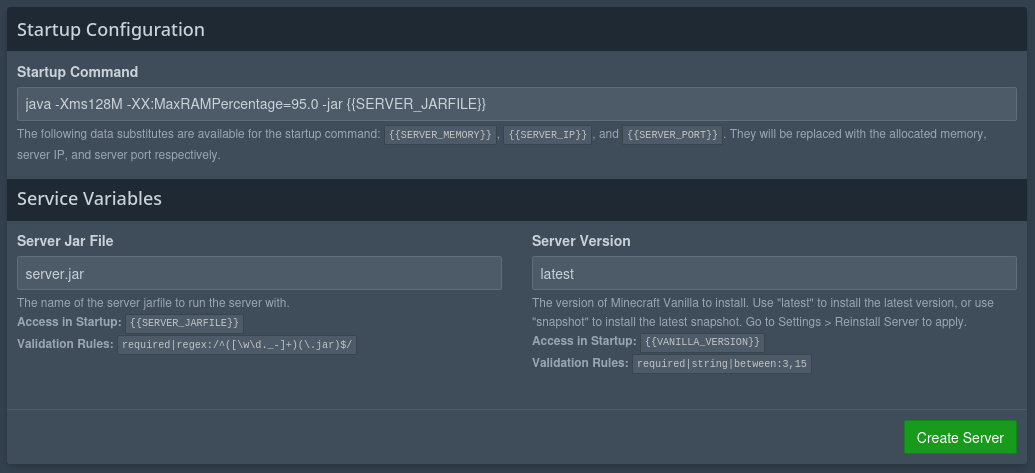 Bash:java -Xms128M -XX:MaxRAMPercentage=95.0 -DPaper.IgnoreJavaVersion=true -jar {{SERVER_JARFILE}}