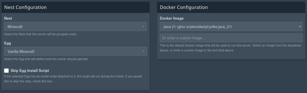 - Egg: тип сервера (Paper, Vanilla, Forge)